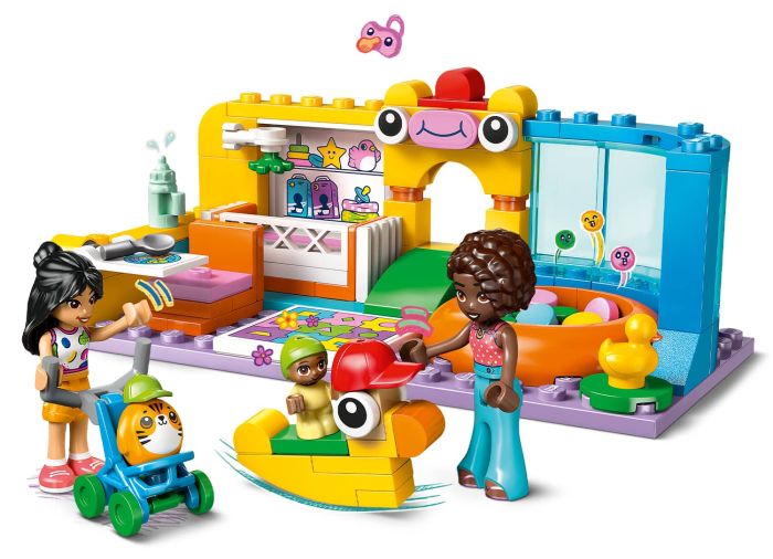 Inspire kids to build the playroom, where Aliya and Liann are caring for Aliya’s baby sister, Amalia. There’s everything kids need to create friendship stories. They can feed the baby at the table – a clever flip function shows just how much mess a baby can make at mealtimes! When it’s time for a nap, there’s a crib for Amalia. Playtime is catered for too, with a slide, playmat, ball pit, a rocking duck ride and a cute plushie-style LEGO piece. Then the friends take Amalia for a walk in the baby stroller toy.
