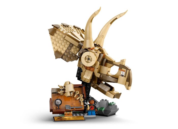 - Posable Triceratops skull with opening jaw – This kids’ toy skull can be posed open or closed, either on the stand or alongside the minifigure, dig site plate, mini-fossils and excavating tools