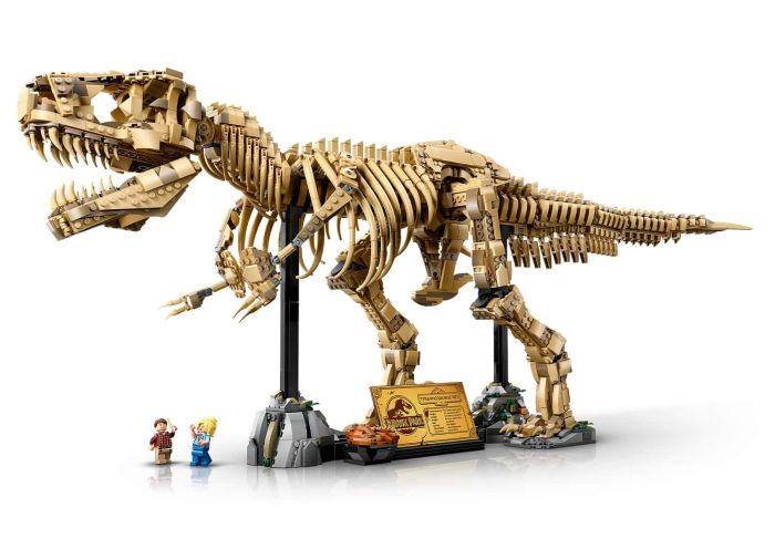 - T. rex fossil display for adults – Features a Tyrannosaurus rex fossil model with articulated joints, a stand, a plaque and hidden dig-site Easter eggs including an ‘amber’ piece and 2 minifigures