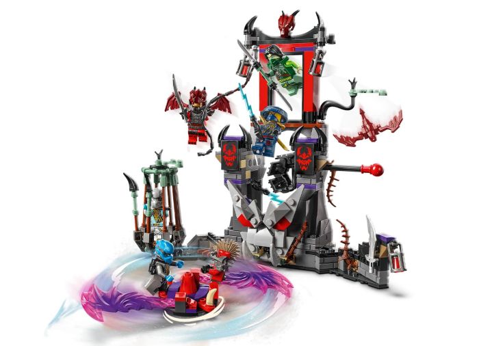 The Dragonians’ hideout includes a cage to detain ninja characters, a retractable bridge, a pit with for the ninja to fall into with a skeleton, a climbing rope so the ninja can escape and a spinner toy with space for 2 characters to sit inside and knock over enemies.