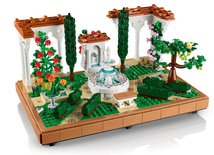 - What’s in the box – The LEGO® Fountain Garden features a tiered fountain, lavabo, 2 cypress trees, flowering grape vines, 4 pergolas and tiled pathways, plus luna moth, bird and frog figures