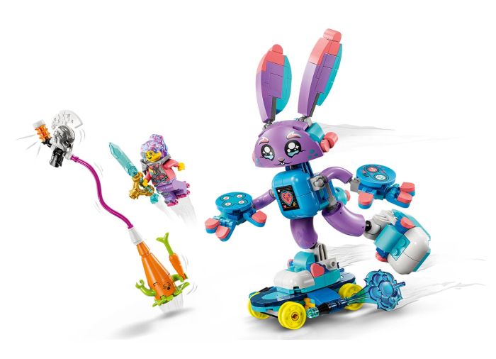 Young dreamers will have fun building the Bunchurro figure, a cool new version of Bunchu the Bunny that has a video game screen on its belly and wears gaming controller gloves and sneakers, before discovering 2 ways to transform it. They can accessorize the rabbit model with a skateboard and boosters or an awesome jetpack. The toy rabbit is highly posable in all modes, and the action is brought to life by an Izzie minifigure, who attaches to the back of Bunchurro to encourage imaginative role play.