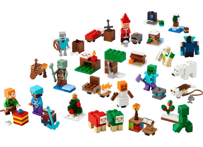 - LEGO® Minecraft® Christmas minifigures – Minifigures include Alex, Steve, a Creeper™, drowned, stray, snow golem, zombie anda Santa villager, all with accessories and festive touches
