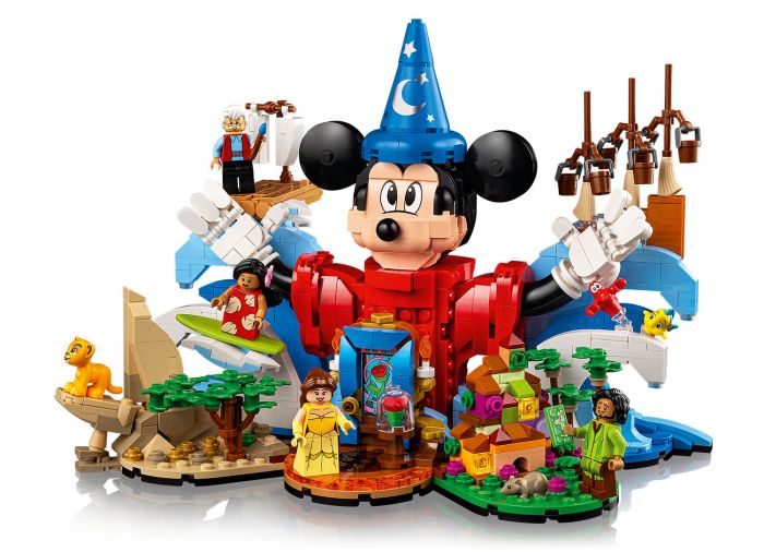 With Mickey Mouse in his sorcerer’s apprentice outfit at the center, this collectible model showcases many popular Disney characters and includes the first-ever LEGO minifigure of Belle from Beauty and the Beast with the enchanted rose. Other vignettes include Geppetto on a raft in Pinocchio, Lilo surfing in Lilo & Stitch, Simba atop Pride Rock in The Lion King, Bruno at Madrigal House in Encanto, the magic Brooms carrying water in Fantasia and Sebastian the crab and Flounder the fish in The Little Mermaid.
