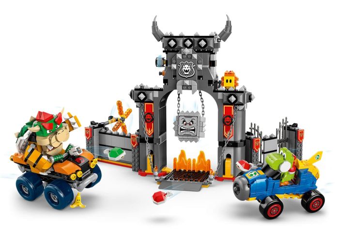 - Bowser’s Castle – Stage Bowser vs. Yoshi races, smash through walls and dodge the plunging Thwomp with this LEGO® Super Mario™: Mario Kart™ toy vehicle playset for kids