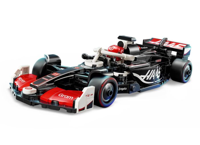 The F1 model car features a cockpit that opens by lifting the halo bar, a rear wing, wishbone suspension, sponsor stickers and wider rear tires imprinted with “Pirelli.” The F1 race car also comes with a driver minifigure wearing a MoneyGram Haas F1 Team outfit and a winged helmet to place inside the cockpit.