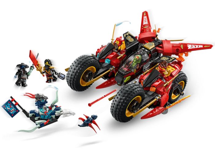 - Detachable ninja vehicles – The large NINJAGO® vehicle can be separated into 3 smaller vehicles: Kai’s ninja bike, Wyldfyre’s ninja bike and Frak’s aircraft jet toy with 2 stud shooters