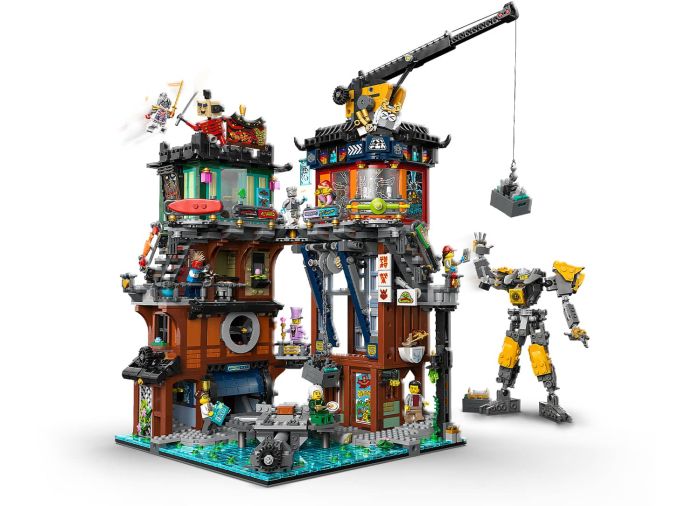 - Customizable mech toy – For the first time a NINJAGO® City model comes with a posable mech toy kids can customize with armor and stickers before displaying on a platform