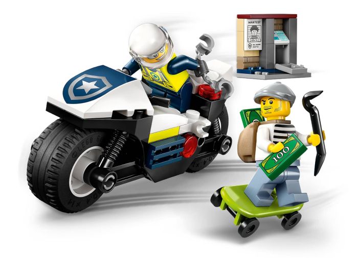 Surprise your young action hero with this exciting LEGO® City Police Motorcycle Chase (60455) playset. Perfect for little builders aged 4 and up, it features a cool police motorbike with wide tires, a crook’s getaway skateboard and an opening mini-ATM with a toy banknote. Just add the police officer and crook minifigures for hours of imaginative play and storytelling.
