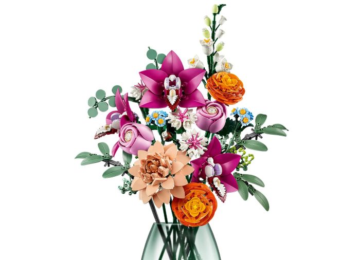 - LEGO® flowers – The set features 15 buildable flower stems, including daisies, cornflowers, eucalyptus, elderflowers, roses, ranunculus, cymbidium orchids, a campanula and a waterlily dahlia