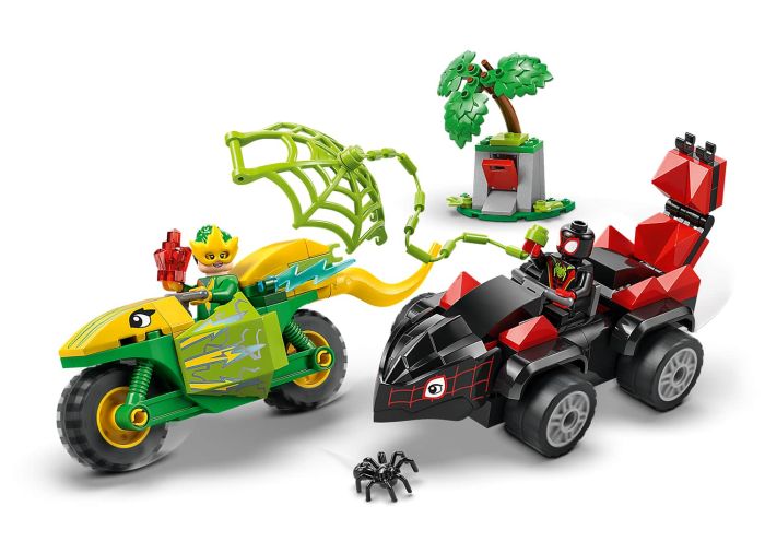 The set recreates action from the ’Dino-Webs’ season of the Spidey And His Amazing Friends TV show. It includes 2 Super Hero minifigures and 2 push-along dino-vehicles: Miles "Spin" Morales in a stegosaurus car and Electro in a dilophosaurus motorcycle. A large web element, a crystal hidden inside a rock, plus landscaping accessories inspire kids’ creative role play. Inside the box, each bag contains bricks and a large Starter Brick for a quick-to-build model and character, so play gets started quickly. Intuitive instructions are provided in the form of a colorful picture-story guide.