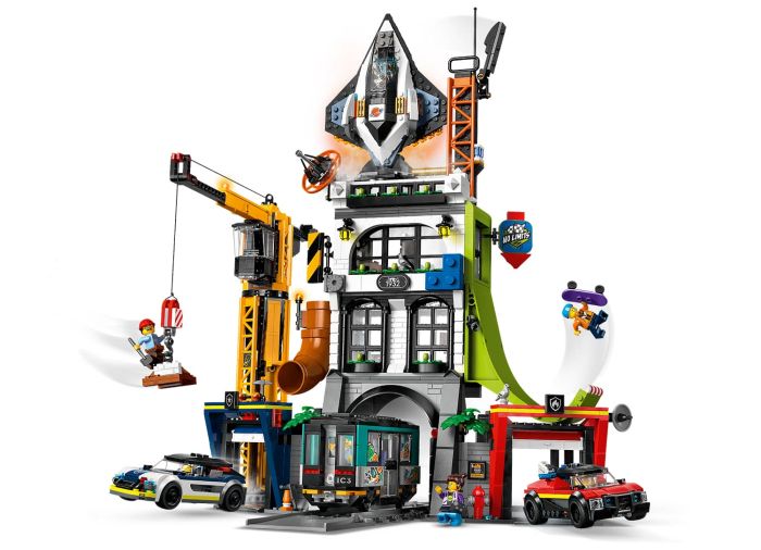 - What’s in the box? – Models include the city tower, a toy crane, metro train, spaceship and police and fire vehicles, plus 7 minifigures, including 5 characters from the LEGO® City No Limits TV show