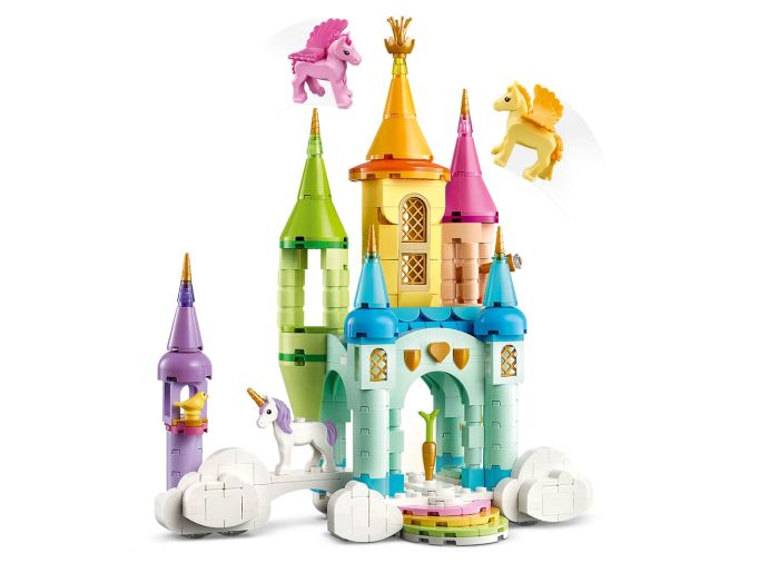 Play out adventures in a magical fantasy world with this LEGO® Creator 3in1 Unicorn Castle (31175) toy set. The castle with 4 towers and 2 turrets features a bird house with 1 bird, a rainbow staircase, a fountain, a diamond room, a telescope and a golden carrot. It also comes with 1 unicorn and 2 Pegasus characters: a yellow Pegasus toy, a pink Pegasus toy and a white unicorn toy for kids to dream up amazing stories.