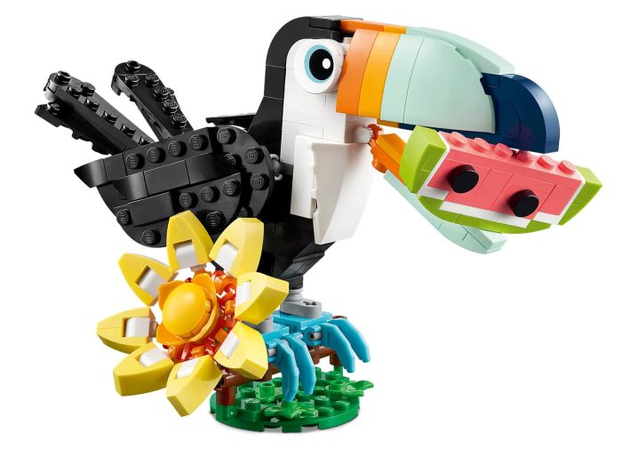 Enjoy tropical fun with this beautiful LEGO® Creator 3in1 Wild Animals: Tropical Toucan (31173) building set. The LEGO toy bird sits on a branch covered with a large brick-built flower and a slice of watermelon, and for added play value it can move its wings, beak and tail feathers.