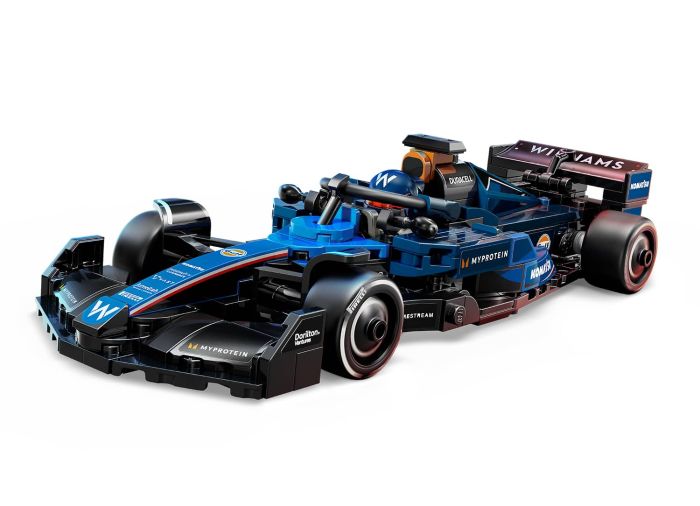 The F1 model car features a cockpit that opens by lifting the halo bar, a rear wing, wishbone suspension, sponsor stickers and wider rear tires imprinted with “Pirelli.” The buildable F1 toy car also comes with a driver minifigure wearing a Williams Racing outfit and a winged helmet to place inside the cockpit.